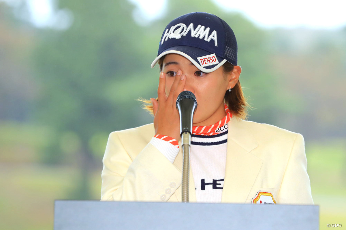 前日からの降雨で最終日の中止が決定し、2日目を終えてトップにいた20歳の永井花奈がタイトルを手にした。思わぬ形での初優勝に驚きを隠せず、家族とともに出席した表彰式で「予想外の中止だったけど、本当にうれしい」と涙を流した。