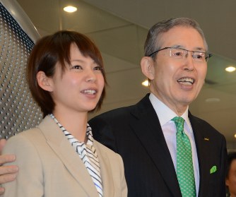 ▽16:50 港区東新橋 所属先のANA本社で金メダル祝勝会、社員の前であいさつ
