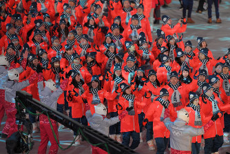 【平昌・岩壁峻】平昌冬季五輪は25日、17日間にわたる熱戦を終え、夜8時からの閉会式でフィナーレを迎えた。各国・地域が整然と入場行進をした開会式と異なり、閉会式では各国選手らが群れをなして歩くように、和やかに入場。日本選手団もサンライズレッドのコートに紺色の帽子やマフラーをまとい、手を振りながらスタジアムに入った。式の最後には各国・地域の選手らが一緒になり、音楽に合わせて踊るなど、戦いを終えてリラックスした表情を見せていた。