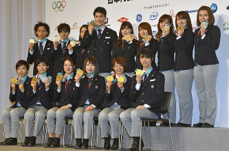 高木菜那(25)=日本電産サンキョー=は、新種目のスピードスケート女子マススタートと、団体追い抜きで優勝し、夏冬を通じて女子で初めて1大会2個の金メダルを獲得し、「大会終盤にあったレースに集中できたのは、ここにいるメダリストの方々の思いがつまったレースや演技があったから。チームジャパンの力があっての金メダル」と笑顔を見せた。妹で、団体追い抜き金に加え、1500メートル銀、1000メートル銅で3色のメダルをそろえた高木美帆(23)=日体大助手=は「友人や家族からたくさんのメッセージと勇気をもらったおかげで、最後まで強い気持ちでレースに臨めた」と感謝を口にした。