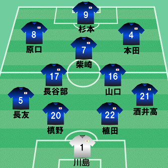 GK:川島、DF:長友、槙野、植田、酒井高、MF:山口、長谷部、柴崎、FW:原口、杉本、本田