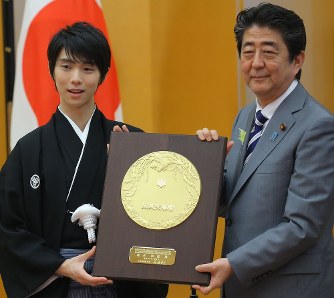 2月の平昌(ピョンチャン)冬季五輪フィギュアスケート男子で66年ぶりの五輪連覇を果たした羽生結弦選手(23)=ANA=に2日、国民栄誉賞が授与された。首相官邸で表彰式があり、安倍晋三首相から表彰状や盾が授与された。国民栄誉賞の受賞は27例目。スケート界では初めてで、個人としては最年少受賞。